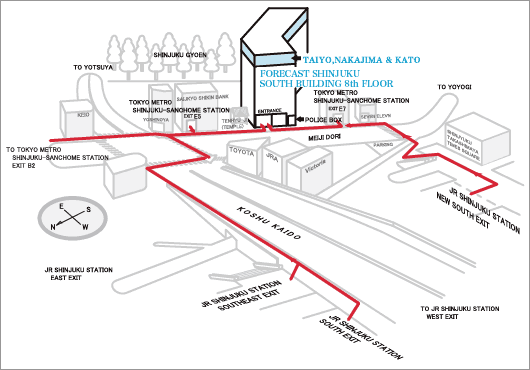 If using a map application on a smartphone or tablet for directions, please search for the FORECAST SHINJUKU SOUTH building. Alternatively, the street address of our office is "4-3-17 Shinjuku, Tokyo".