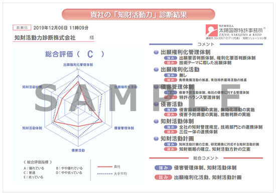 本知財活動力診断は、2019特許情報フェアにて、多くの企業様に御入力頂き、各企業様の簡易診断をさせて頂き、下記のような診断結果をお渡しさせて頂きました。その結果、改めて、各社様から参考になった旨のお言葉を頂きました。