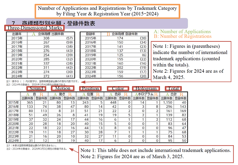 In 2024, 272 applications and 156 registrations were filed for three-dimensional marks, 31 applications and 12 registrations for sound marks, 18 applications and 19 registrations for motion marks, 40 applications and 17 registrations for position marks, and six applications and two registrations for color marks, while no applications or registrations were recorded for hologram marks.