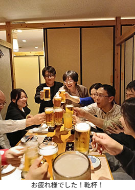 打ち上げは公園近くの立川駅前にて。レース中のエピソードや次回大会への意気込みなどを語り合いながら、親睦をさらに深めることができました。よく飲みました(笑)